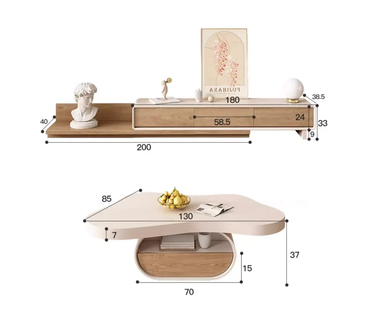 تُعتبر طاولة القهوة مع طاولة التلفاز من تصميم منجلان قطعة فريدة وأنيقة لتجميل غرفة المعيشة الخاصة بك. يتميز تصميمها بالشكل الأنيق الذي يضفي لمسة جمالية على الديكور العام للمنزل. يمكنك بسهولة تنظيفها باستخدام مسحة رقيقة عند الحاجة، مما يجعلها قطعة عملية وسهلة الصيانة.