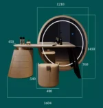المقعد المرفق مع التسريحة يأتي بمقاسات مريحة، حيث يبلغ ارتفاعه 54 سم وعرضه 48 سم. هذه المقاسات تجعله مناسبًا للاستخدام بشكل يومي، سواء كان للجلوس أمام التسريحة أو للاسترخاء. كما أن المواد المستخدمة في تصنيعه، مثل الإسفنج عالي الجودة والجلد الفاخر، تجعله مريحًا وأنيقًا في آنٍ واحد.