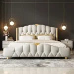 الخامات المستخدمة في تصنيع الأسرة تشمل خشب هندسي وخشب زان روماني عالي الجودة، مع إطار من الستيل المذهب الصلب المغطى بالجلد الإيطالي الفخم والمبطن بالإسفنج عالي الكثافة.