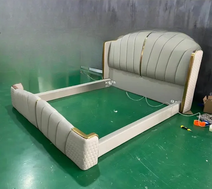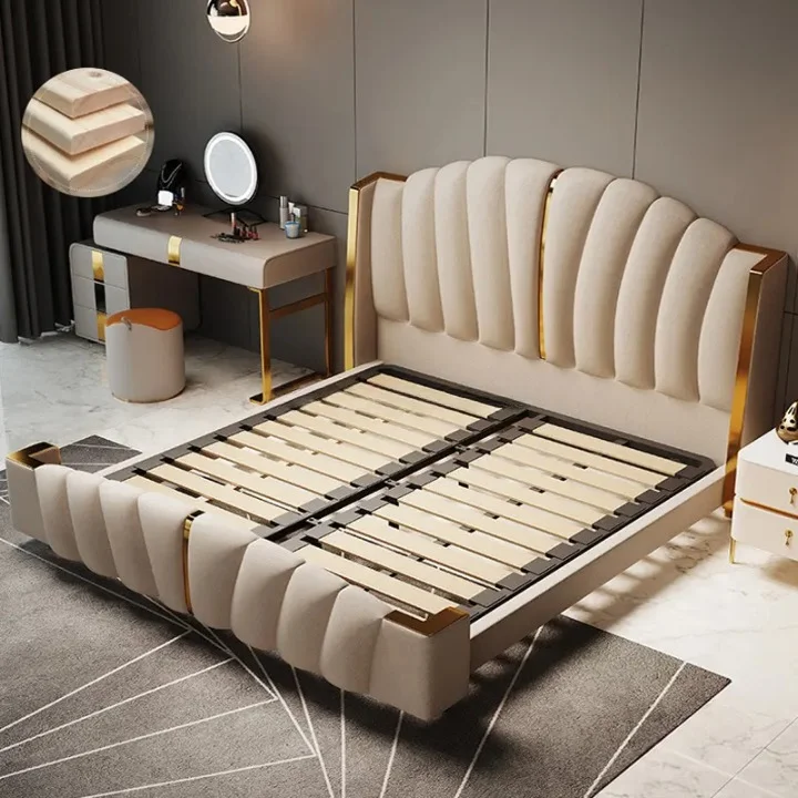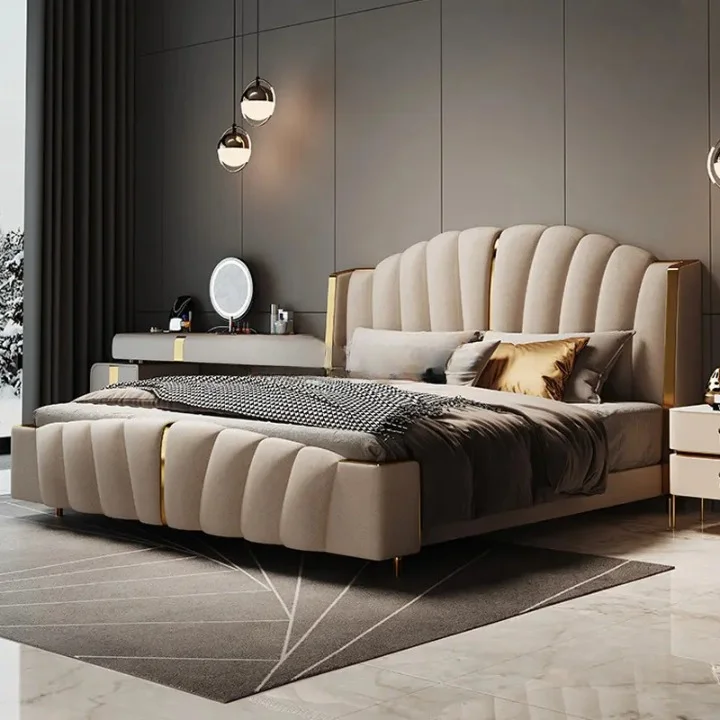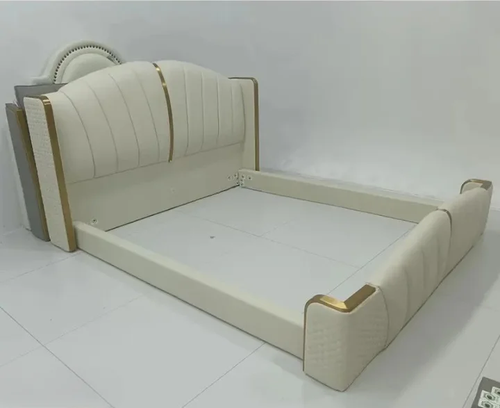 سرير مودرن من Master Room يضفي لمسة عصرية وأنيقة على غرفة النوم. تصميمه المميز يستخدم خامات جلد وستيل تضيف لمسة من الأناقة والفخامة إلى ديكور الغرفة. بالإضافة إلى ذلك، يمكن تنظيفه بسهولة بمسحة رقيقة، مما يجعله مناسباً للحياة اليومية العصرية.