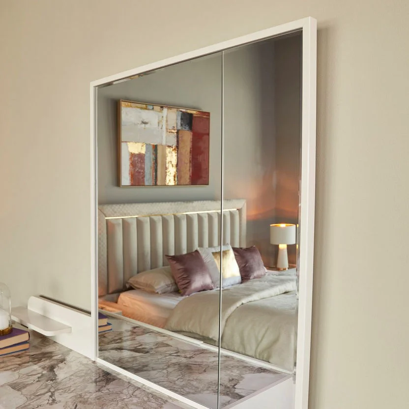 هيكل مصنع من خشبي هندسي وخشب زان روماني عالي الجودة مع اقدام من الستيل المذهب الصلب مع مرأة من الزجاج المقوي المقاوم للصدمات.