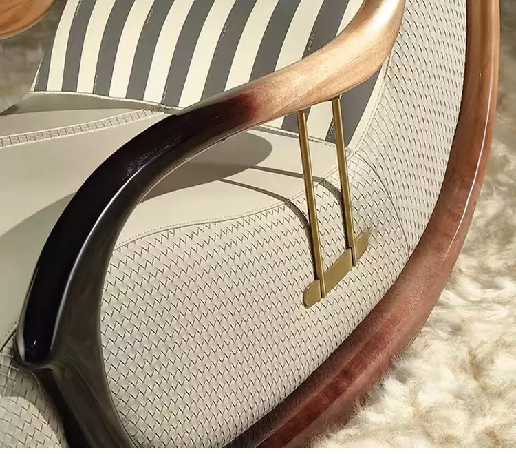 تم تصميمه بخامات عالية الجودة لضمان المتانة والراحة الفائقة. الهيكل مصنوع من خشب هندسي وخشب زان روماني عالي الجودة، مما يوفر القوة والاستقرار. المقعد محشو بإسفنج عالي الجودة لضمان الراحة والدعم أثناء الجلوس لفترات طويلة. كما أن الكرسي مغطى بجلد عالي الجودة يضفي لمسة فاخرة على التصميم العام، ويُسهل عملية التنظيف والصيانة.