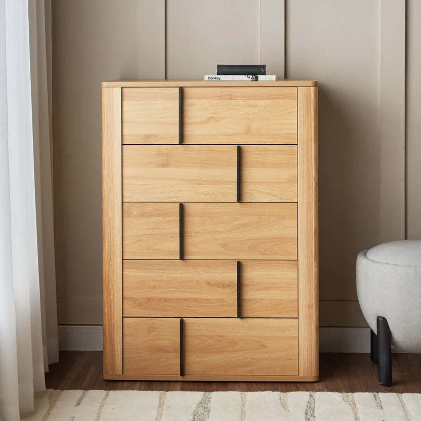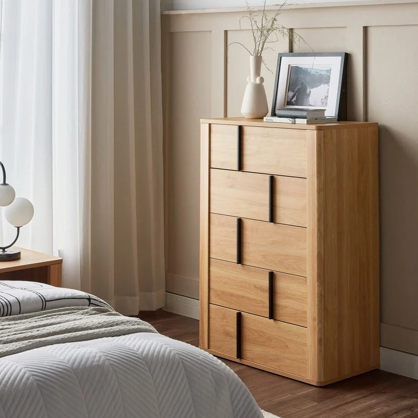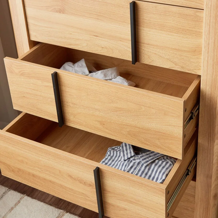 تحتوي وحدة الادراج على 5 ادراج واسعة توفر مساحة تخزين كبيرة لملابسك أو أغطية السرير أو أي متعلقات أخرى. تتميز الأدراج بآلية انزلاق سلسة تجعلها سهلة الفتح والإغلاق.